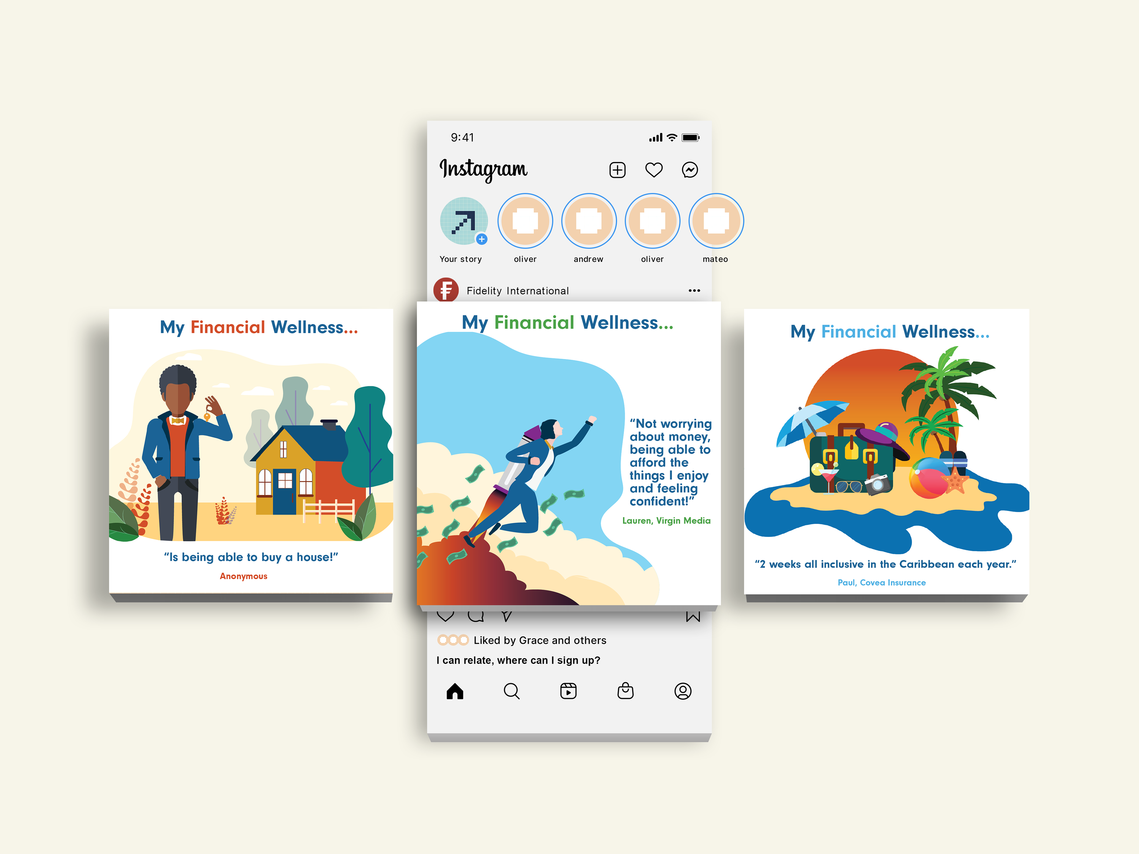 Each design centres around a quote drawn from real customer feedback, supported by a clean layout and use of brand colours. I created platform-specific versions for both LinkedIn and Instagram to make sure each post felt natural within its platform environment. The tone is human and relatable, while still professional and the overall approach is both visually cohesive and emotionally resonant, reflecting Fidelity’s commitment to making financial wellbeing accessible and understandable.