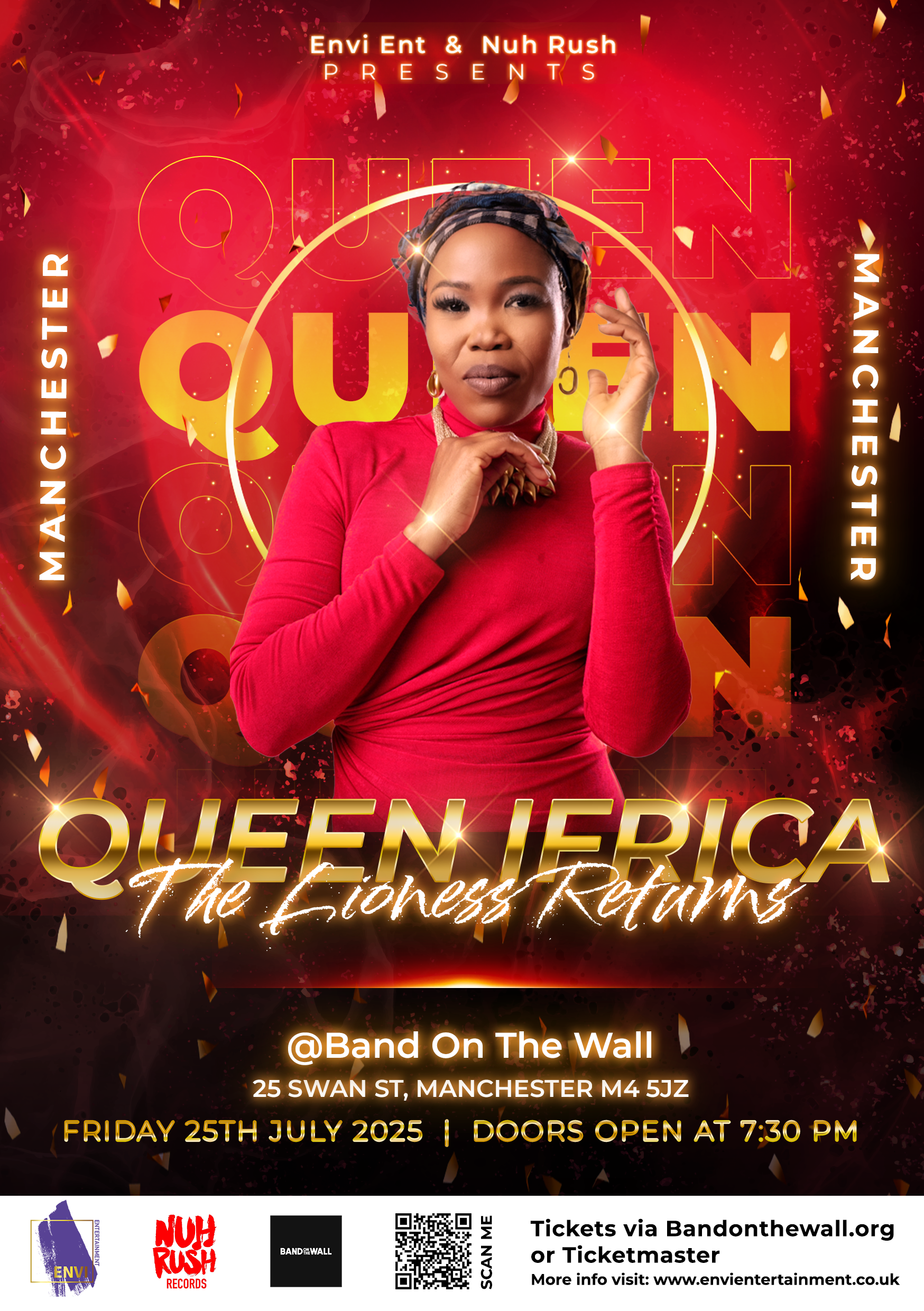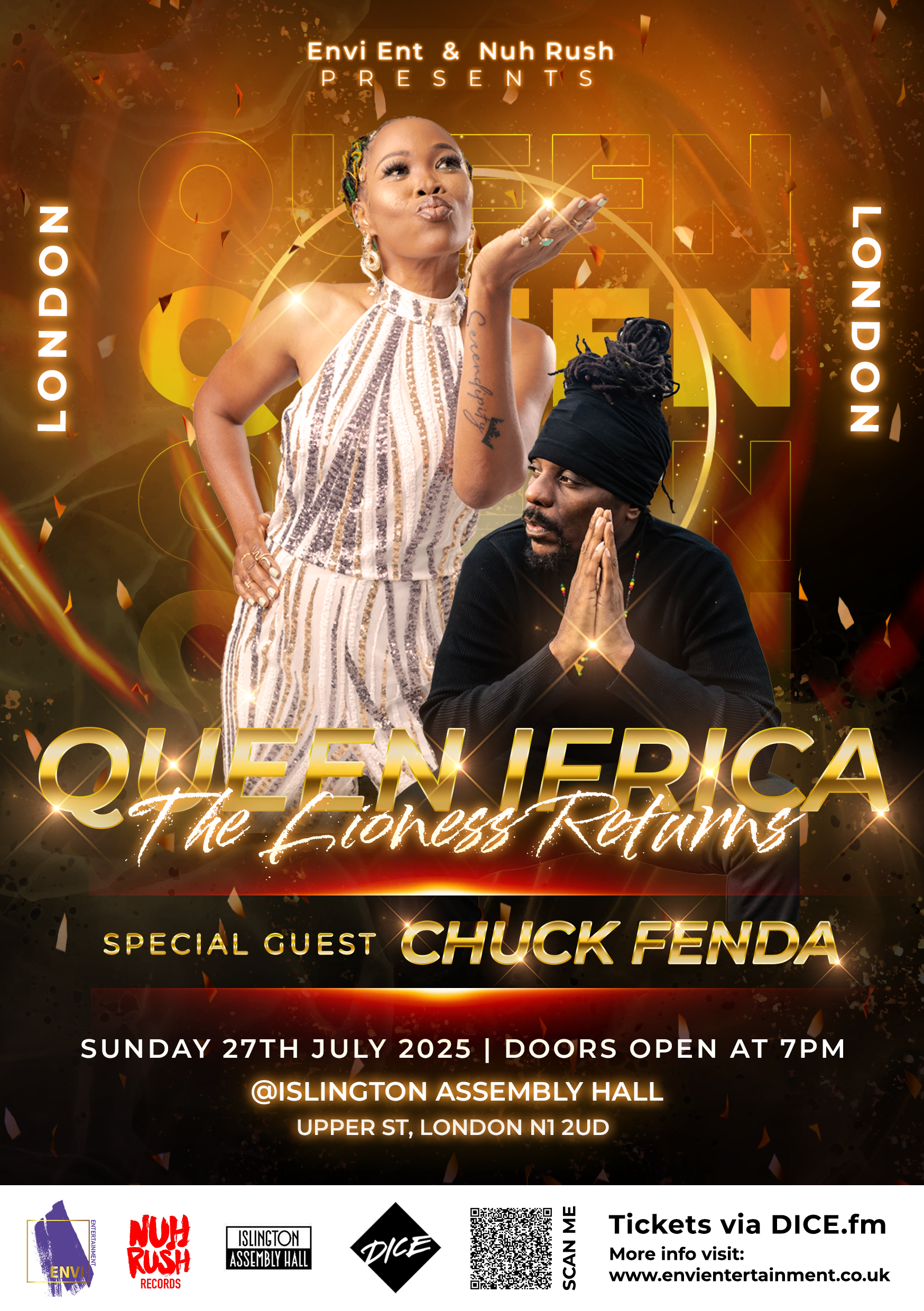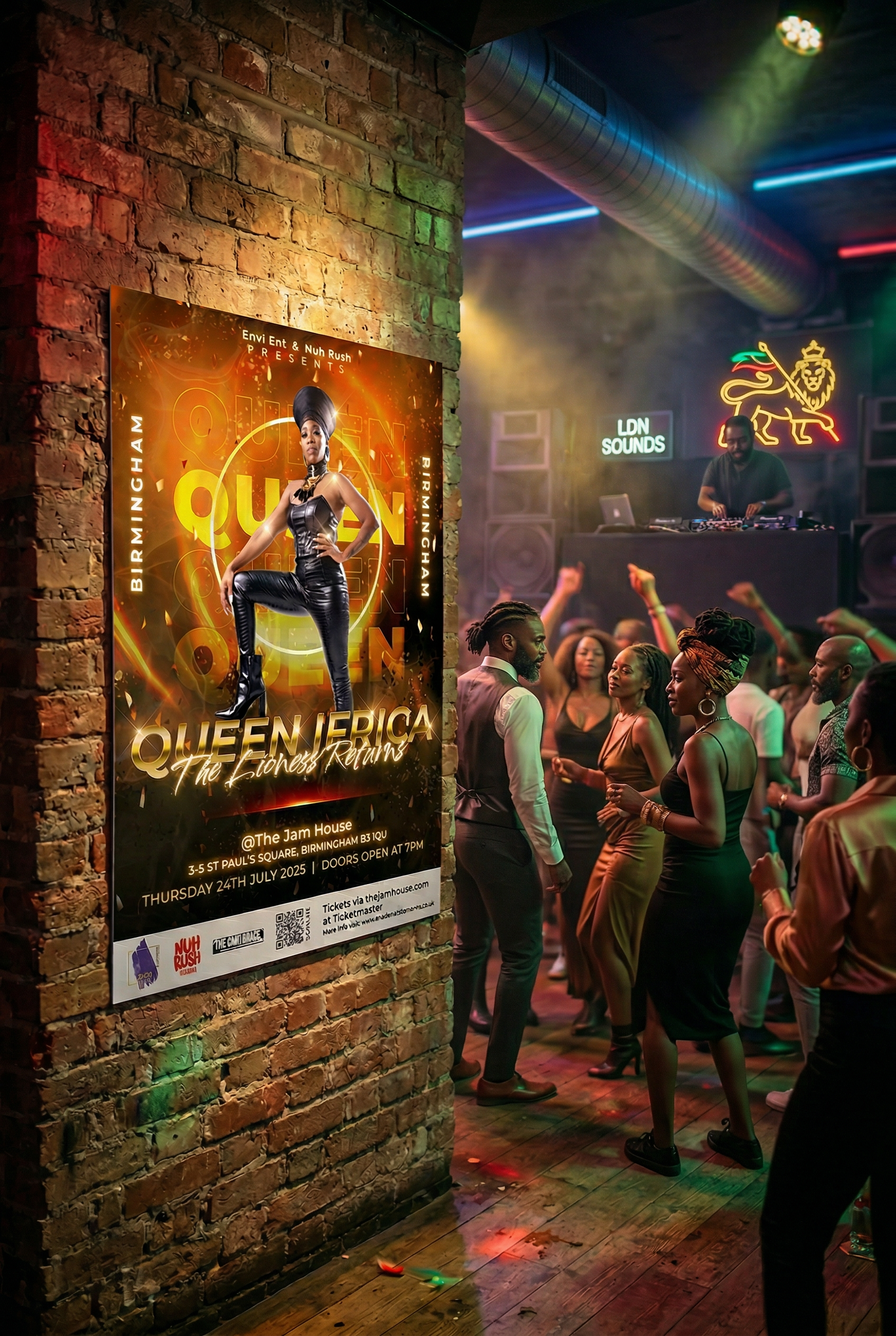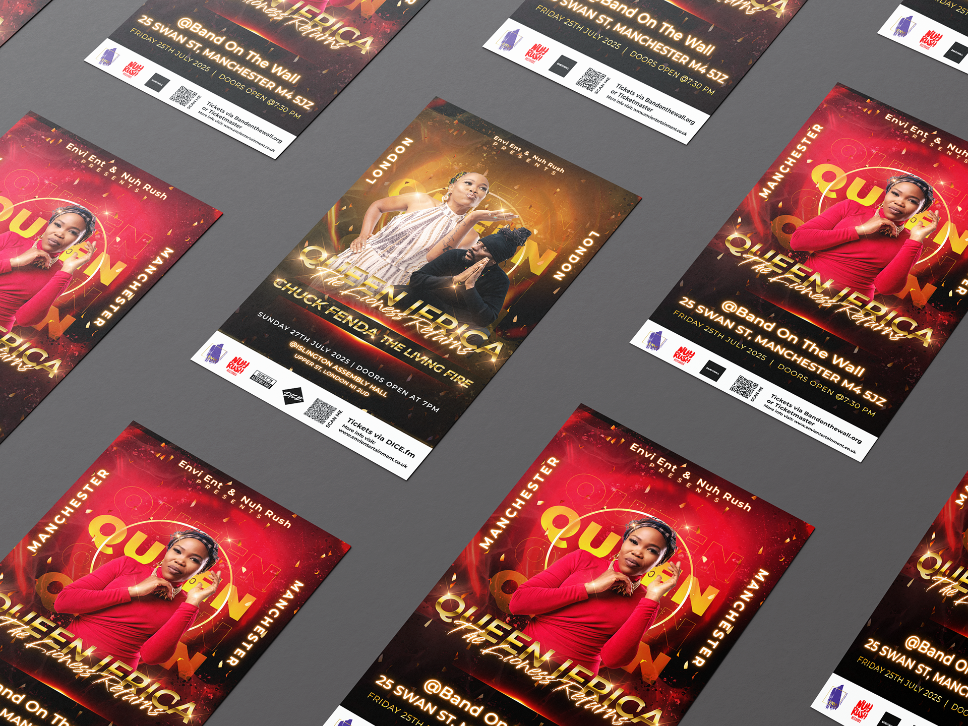 These flyers were produced for a UK tour featuring the reggae artist Queen Ifrica. The primary goal was to make her the main focus, so I used a bold, vibrant palette and eye-catching typography to immediately draw the viewer’s attention to her image. The composition places the artist front and centre, with supporting text and details arranged to support the overall visual hierarchy. The design maintains a dynamic and celebratory tone, reflecting the artist’s energy and cultural presence while making sure the promotional message remains clear and compelling.